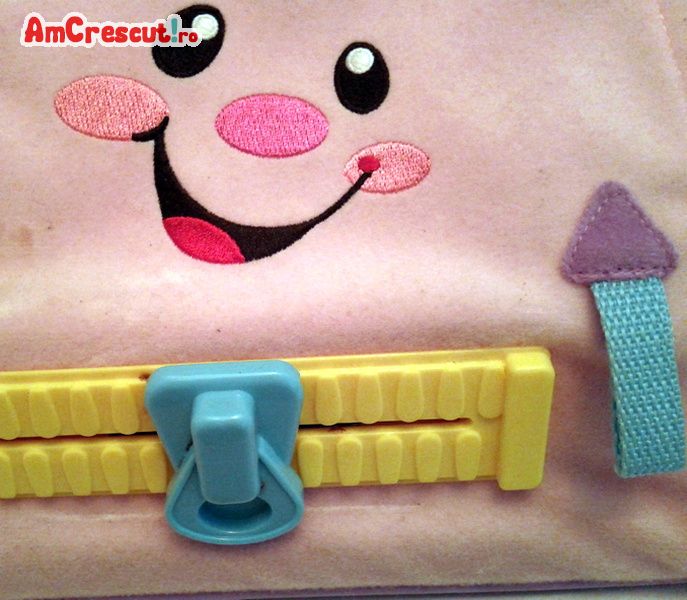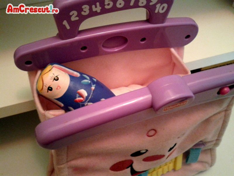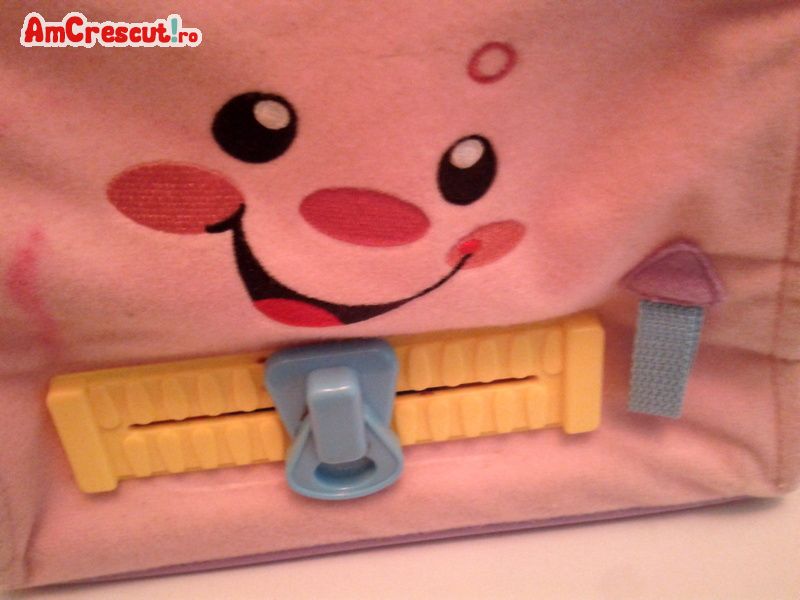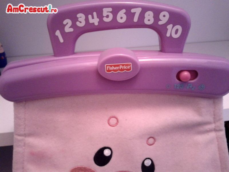 Dotata cu un fermoar urias. La desfacerea fermoarului se aud melodii si se numara pana la zece in limba engleza. Functioneaza cu 3 baterii mici. Dimensiuni lungime 26 cm, latime 22 cm la baza. Culoare roz cu desen vesel pe fata gentutei.